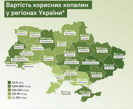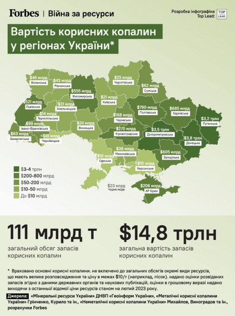 Forbes оцінив вартість корисних копалин України у $14,8 трлн. На початок 2005 року розвідані запаси оцінювалися в урядових документах як «$150 000 на душу населення, а за оцінками західних експертів — понад $200 000», що відповідало сукупній оцінці $7−10 трлн.