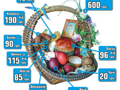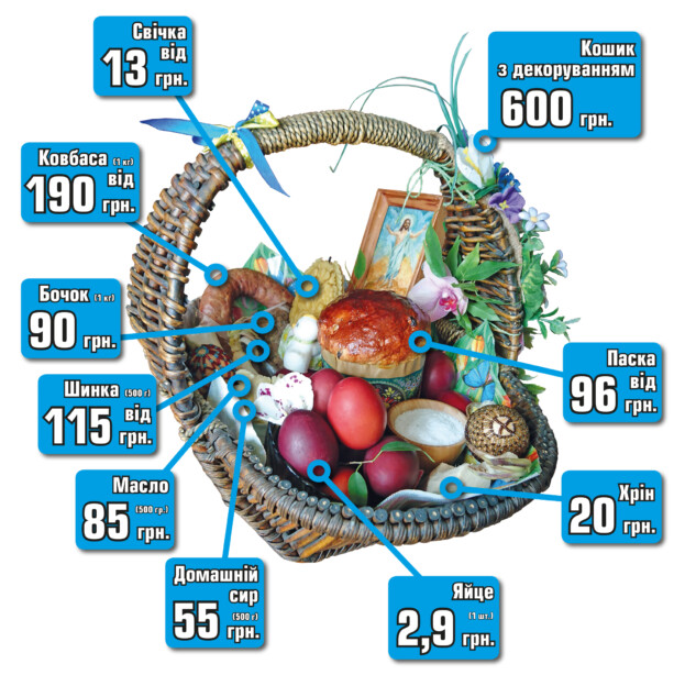 Оздоблення кошика, свічка та сам кошик також відзначилися високою ціною. Оскільки ринки на карантині, то там їх не купиш, а магазини флористики пропонують уже готовий задекорований кошик разом із доставкою. Великий кошик, у який поміститься дві великі паски, вартуватиме 600 грн., середній – 450, а маленький (дитячий) – від 250 грн.
