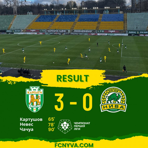 Сьогодні, 24 листопада, в заключному 18-турі чемпіонату України серед команд першої ліги тернопільська «Нива» грала у Львові з місцевими «Карпатами» і поступилася супернику з великим рахунком – 0:3.