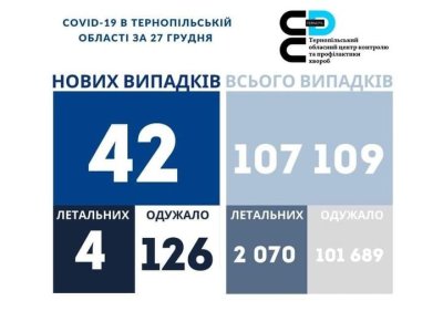42 нових випадкі коронавірусної хвороби COVID-19 зафіксовано в Тернопільській області за 27 грудня 2021 року. Про це повідомляє Державна установа «Тернопільський ОЦКПХ МОЗ України».