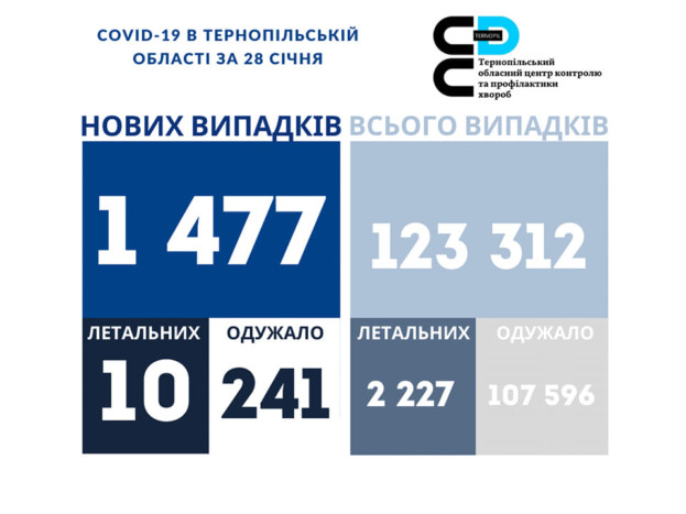 1 477 нових випадків коронавірусної хвороби COVID-19 зафіксовано в Тернопільській області за 28 січня 2022 року. Про це повідомляє Державна установа «Тернопільський ОЦКПХ МОЗ України».