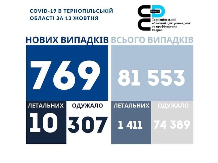 769 нових випадки коронавірусної хвороби COVID-19 зафіксовано в Тернопільській області за 13 жовтня. Про це повідомляє Державна установа «Тернопільський ОЦКПХ МОЗ України».