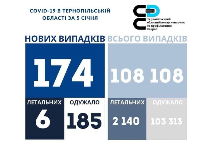 174 нових випадки коронавірусної хвороби COVID-19 зафіксовано в Тернопільській області за 5 січня 2022 року. Про це повідомляє Державна установа «Тернопільський ОЦКПХ МОЗ України».