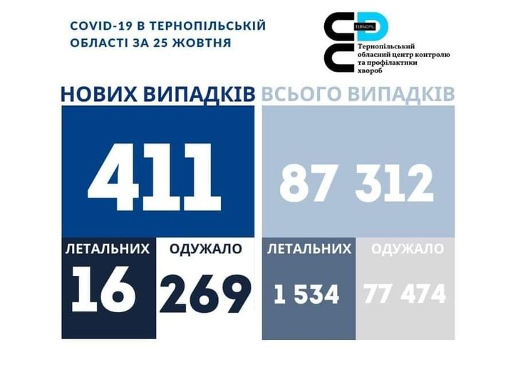 411 нових випадів коронавірусної хвороби COVID-19 зафіксовано в Тернопільській області за 25 жовтня. Про це повідомляє Державна установа «Тернопільський ОЦКПХ МОЗ України»