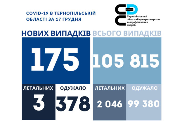 175 нових випадків коронавірусної хвороби COVID-19 зафіксовано в Тернопільській області за 17 грудня 2021 року. Про це повідомляє Державна установа «Тернопільський ОЦКПХ МОЗ України»