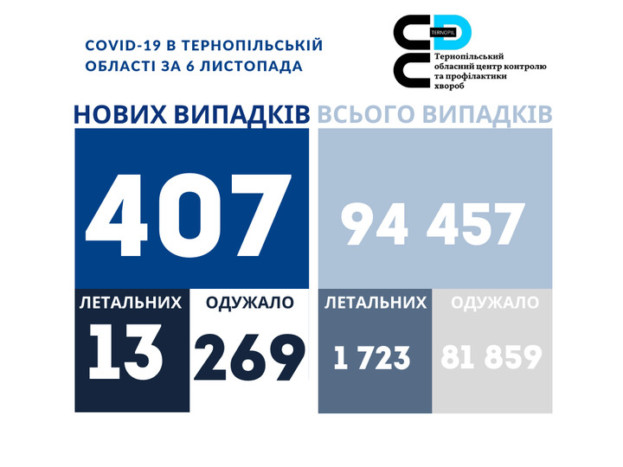 407 нових випадків коронавірусної хвороби COVID-19 зафіксовано в Тернопільській області за 6 листопада. Про це повідомляє Державна установа «Тернопільський ОЦКПХ МОЗ України»