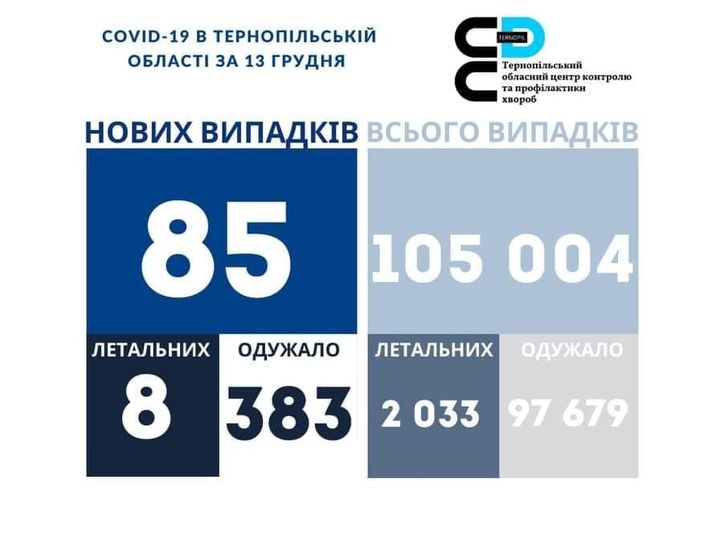 85 нових випадків коронавірусної хвороби COVID-19 зафіксовано в Тернопільській області за 13 грудня 2021 року. Про це повідомляє Державна установа «Тернопільський ОЦКПХ МОЗ України»