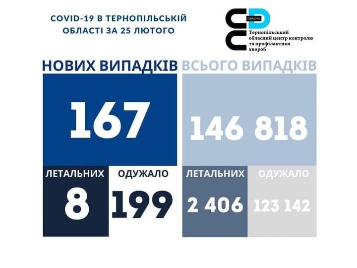 167 нових випадків коронавірусної хвороби COVID-19 зафіксовано в Тернопільській області за 25 лютого 2022 року. Про це повідомляє Державна установа «Тернопільський ОЦКПХ МОЗ України».
