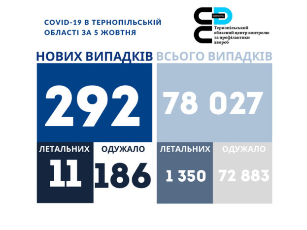 292 нових випадки коронавірусної хвороби COVID-19 зафіксовано в Тернопільській області за 5 жовтня 2021. Про це повідомляє Державна установа «Тернопільський ОЦКПХ МОЗ України».