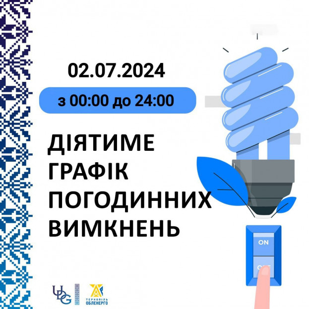 У вівторок, 02 липня, з 00:00 до 24:00 год, на Тернопільщині прогнозується застосування погодинних вимкнень.