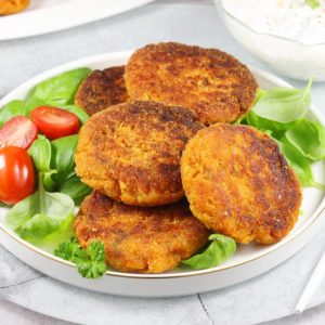 Приготуйте соус: змішайте йогурт, оливкову олію і подрібнений зубчик часнику. Подавайте котлети разом із соусом.