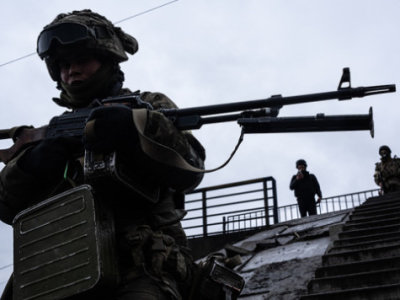 IRPIN, UKRAINE - MARCH 3: Ukrainian soldiers are seen near the recently collapsed bridge which was the target of a Russian missile, near the town of Irpin, Ukraine on March 3, 2022. ( Wolfgang Schwan - Anadolu Agency )