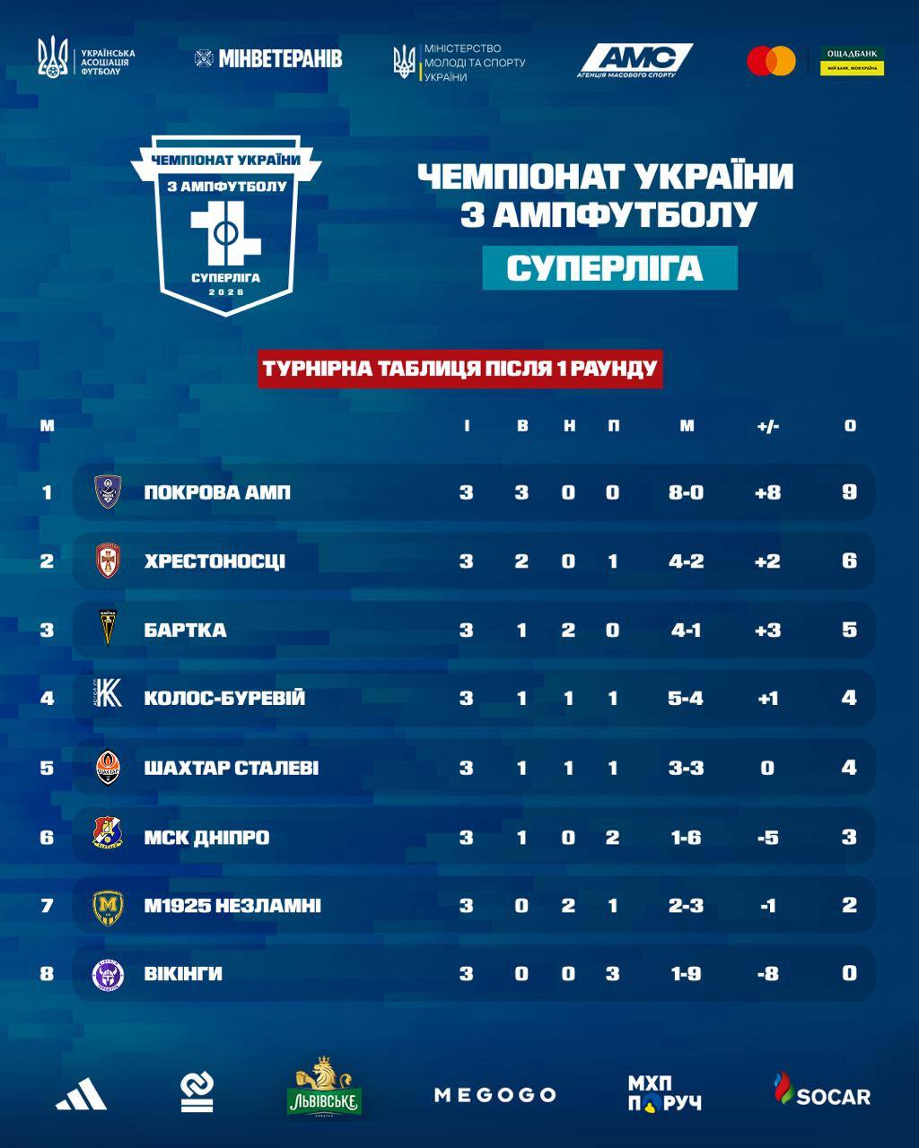 Турнірна таблиця Суперліги чемпіонату України з ампфутболу після 1-го раунду