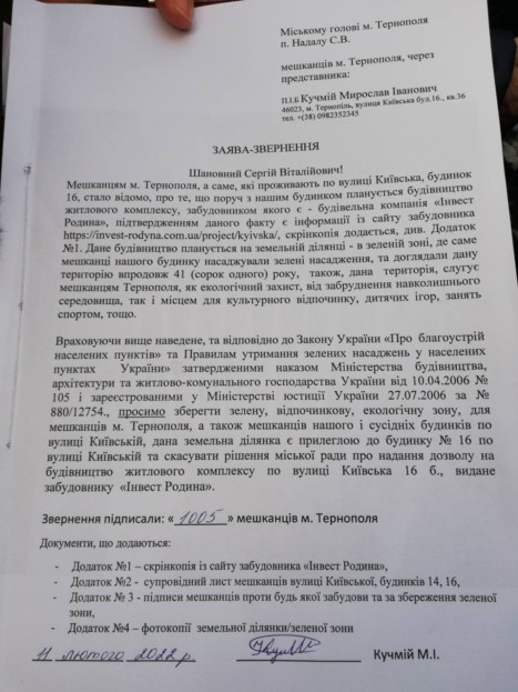 Наприкінці 2018-го року міський голова Тернополя Сергій Надал та депутати проголосували зміну цільового призначення земельної ділянки, яку люди вважають своєю прибудинковою та відпочинковою територією, на «для будівництва та обслуговування багатоквартирного житлового будинку з вбудовано-прибудованими приміщеннями громадського призначення». Скандальності даній ситуації додає той факт, що вся вільна зелена зона (земельна ділянка площею понад 1400 кв. м) відводилась під невеличку одноповерхову будівлю площею біля 50 кв. м.