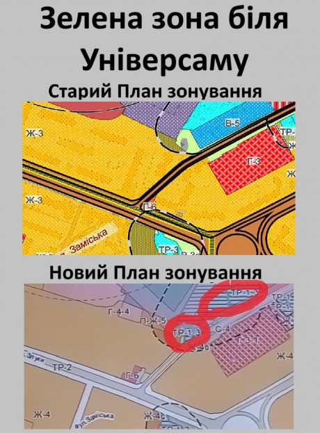Велика ділянка з деревами, кущами й трав’яним газоном, яка десятиліттям слугувала житловим будинкам і дошкільному навчальному закладу екологічною захисною смугою від великого гаражного комплексу змінена на «ТР-1-3» (розміщення терміналів, транспортних вузлів, підприємств, АЗК, СТО, великих стоянок, гаражів).