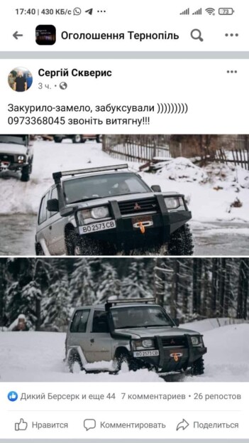 Поки у області вирує негода, а снігоочисна техніка ліквідовує її наслідки, тернополянин пропонує тим, хто застряг у снігу свою допомогу. Оригінальне оголошення чоловік розмістив у одній із груп в соціальній мережі.