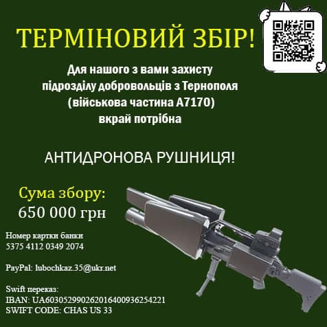 У підрозділу добровольців з Тернополя є нагальна потреба в рушниці, яка знешкоджує москальські бойові дрони. Сума велика. Часу мало. Перемогти у цій війні ми можемо лише разом!