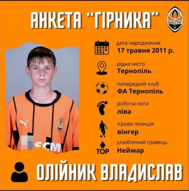 Уродженець Великої Березовиці, що біля Тернополя, вихованець Футбольної академії «Тернопіль», син відомого у минулому футболіста Володимира Ярославовича Олійника (свого часу виступав за команди селища В. Березовиця та ветеранські колективи області) 13-річний Владислав Олійник став гравцем донецького «Шахтаря» (U-14).