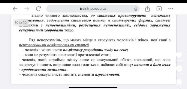 Студенти звинуватили викладача в сексистських наративах. Студентка ТНПУ Влада Кабушкіна розповіла телеканалу TV-4, що її найбільше обурили заяви професора про те, що у зґвалтуванні також винна жертва і що чоловіки – тварини, а діло жінок – народжувати дітей. Дівчина додала, що на заняттях разом із одногрупниками зробили зауваження викладачеві, але він відповів, що це його власна думка.