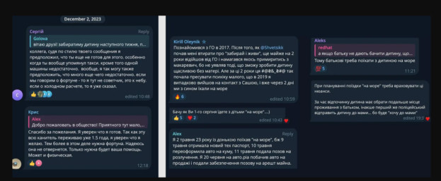 Після попередньої розмови і оплати Олександр Швець особисто додає усіх нових учасників до закритої групи «Батько має право Україна» у Telegram. Тут ви отримуєте доступ до 25 різних чатів за інтересами. Наприклад, є чат ТЦК, де учасники ділять новинами та порадами юристів з приводу мобілізації. Є група ДНЗ, де радять як зробити так, щоб мама не могла без згоди чоловіка перевести дитину у іншу школу. Є регіональні чати для різних міст – Дніпро, Одеса, Херсон, Львів, Харків.