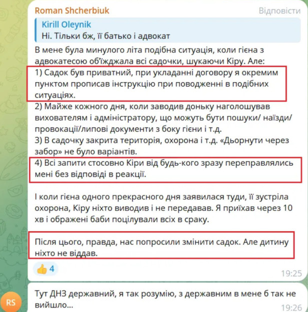 Саме в цьому чаті обговорювали викрадення доньки Алли Голинської з Балти. Нагадаємо, коли у грудні 2020 року суд виніс рішення про «негайне повернення дитина до матері» і поліція приїхала виконувати рішення суду, то дитини не було з батьком – за вказівкою Олександра Швеця бабуся везла дитину в сторону Умані. В той же час батько дитини Вадим Голинський давав пояснення у відділку поліції. Звідти він телефонував Швецю, який особисто контролював всю ситуацію, а в чаті він прописував покрокові інструкції і вказівки учасникам щодо вивезення Вадима, тиску на поліцію, та організації інформаційної кампанії у соціальних мережах.
