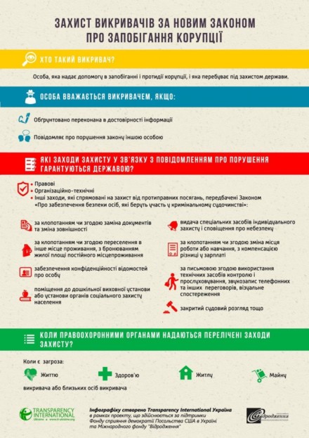 А вже 17 жовтня народні депутати ухвалили у другому читанні та в цілому проєкт закону №1010 щодо викривачів корупції. Закон набуде чинності 1 січня 2020 року. Згідно з ним, люди, які допомагають розкривати корупційні злочини, зможуть отримати від держави винагороду. Крім того, їм будуть гарантовані захист та анонімність.