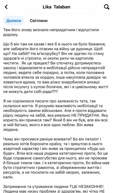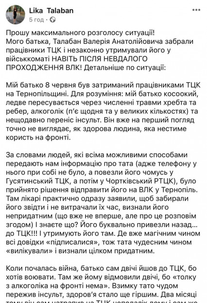 – Мій батько 8 червня був затриманий працівниками ТЦК на Тернопільщині. Для розуміння: мій батько косоокий, ледве пересувається через численні травми хребта та ребер, алкоголік (пʼє щодня та у великих кількостях) та нещодавно переніс інсульт. Він вже на перший погляд точно не виглядає, як здорова людина, яка нестиме користь на фронті.