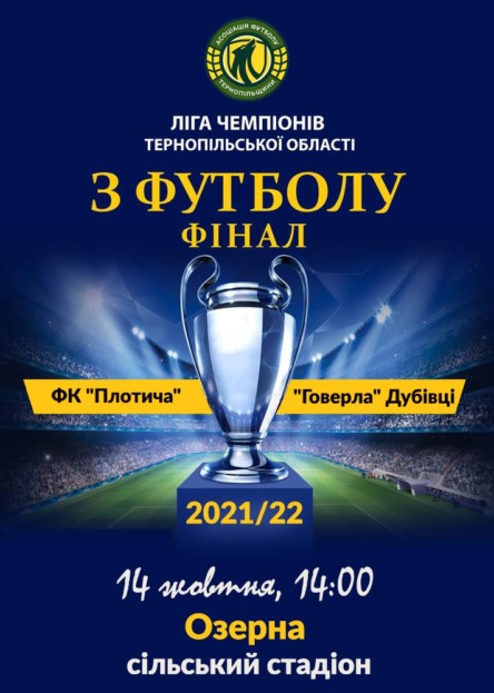 Фінальний поєдинок Ліги чемпіонів Тернопільської області сезону-2021/22 відбудеться у п’ятницю, 14 жовтня, на стадіоні села Озерна (Тернопільський район). Початок матчу між командами ФК «Плотича» та «Говерла» (Дубівці) о 14 годині.