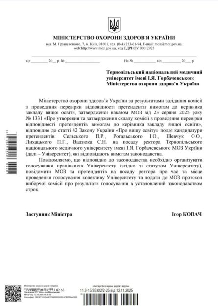 Міністерство охорони здоров’я України повідомило про п’ять кандидатів, які подалися на конкурс на заміщення посади ректора Тернопільського національного медичного університету імені І.Я. Горбачевського.