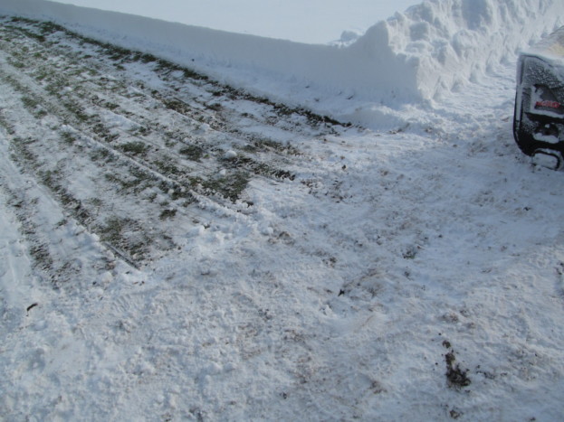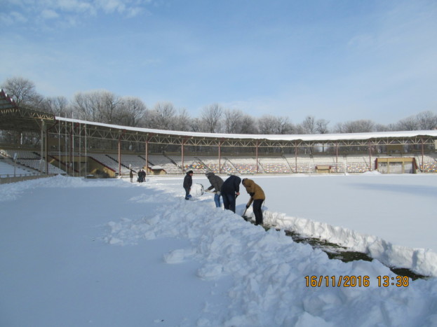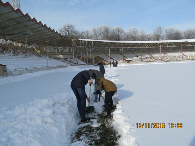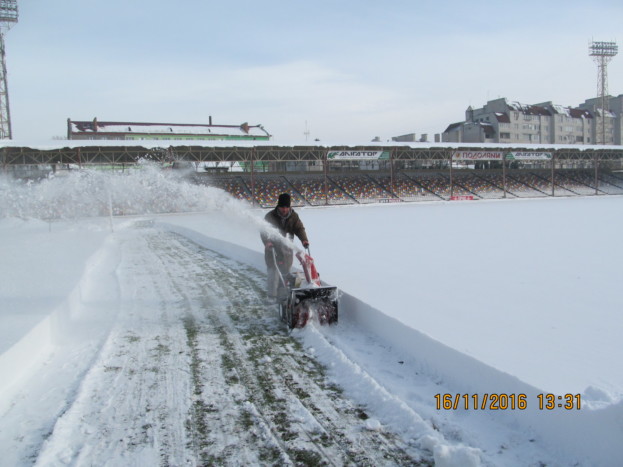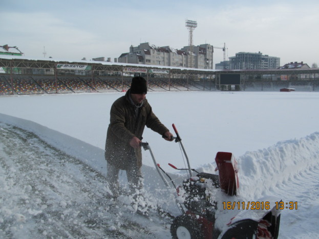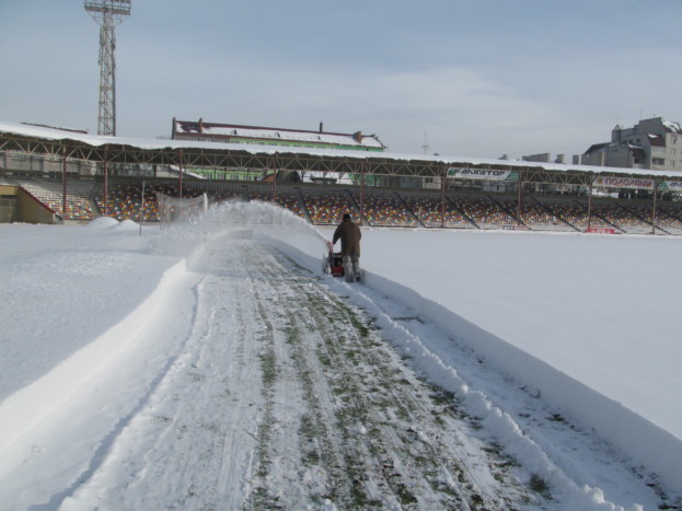 На сьогодні трактор розгортає від снігу бігові доріжки стадіону, а спеціальна машина – відкидає сніг власне з футбольного поля.