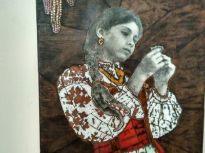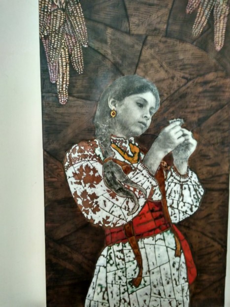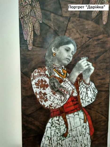 Спочатку поставив фото у рамку, а потім вирішив увічнити в емалях: зробив пишнішим одяг, «подарував» прабабці ще намиста і розмалював тло червоними квітами. Отак фотокартка отримала нове життя. До речі, офорт цієї роботи митець подарував Тернопільському обласному художньому музею.