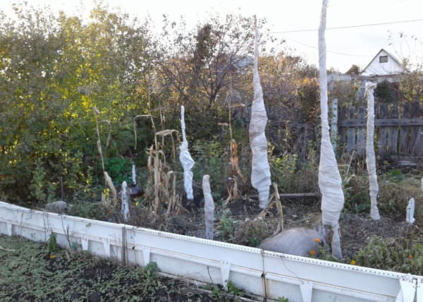 - Якщо стовбур закутаний тканиною або папером (тобто матеріалами, які захистять дерево від природних катаклізмів, але не врятують його від гризунів), то зверху слід створити додатковий шар. Це може бути сітка-рабиця з дрібними осередками, руберойд, гілки шипшини або інших колючих рослин. Головне, щоби миші і зайці не змогли дістатися через них до стовбура.
