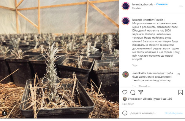 – Ми розпочинаємо втілювати свою мрію в реальність – лавандове поле. На даний момент в нас 1000 живців лаванди і невеличка теплиця. Наше майбутнє дуже цікаве! Багатьом початківцям буде пізнавально стежити за нашими досягненнями і результатами, адже ми також новачки в цій справі. Тому всіх ласкаво-просимо до нашої історії!, – пишуть однодумці.