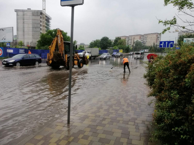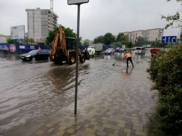 У тому місці і далі збирається вода – автомобілям важкувато проїхати, а щоби води стало менше… працівники дорожньої служби допомагають їй стікати у дощоприймальники оригінальним способом.