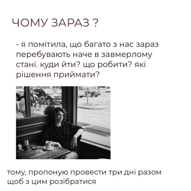 А чи хотіли б ви перестати відчувати безпорадність та страх і спрямувати життя у інше русло? Цей стан дуже близький та зрозумілий організатору, вона прожила його. І саме з нього розпочалися її зміни. Саме тому Юлія Хлопова впевнена в ефективності марафону.