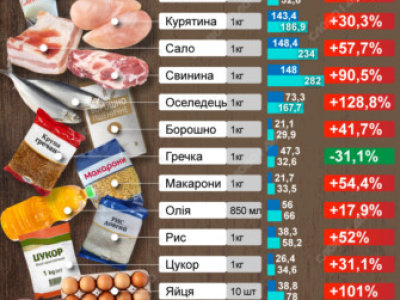 Овочі та фрукти. Зросли ціни на всі овочі з борщового набору: буряк – на 43,9% (близько 20 гривень за кілограм), капуста – на 154,3% (близько 32,3 гривень за кілограм), картопля – на 150,8% (32,6 гривень за кілограм), морква – на 207,6% (28,3 гривень за кілограм), цибуля – на 50% (18,3 гривень за кілограм).