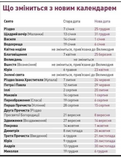 Можливо, не всі про це замислюються, але якщо Різдво будемо відзначати 25 грудня, то й дати святкування інших свят теж змістяться: