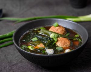 Тепер розглянемо 2 варіанти місо-супу, які можна замовити в асортименті ресторану Рок-н-Рол. Перший з цих варіантів – місо з тофу і такуаном. До слова, ця страва є вегетаріанською. Тож якщо ви надаєте перевагу вегетаріанській кулінарній традиції, такий суп стане для вас гарним вибором. У складі є такі інгредієнти: гриби печериці, бобова локшина, дайкон, зелена цибуля, тофу, бейбі шпинат та паста місо. Порція важить 600 грамів, а її ціна – 179 гривень.