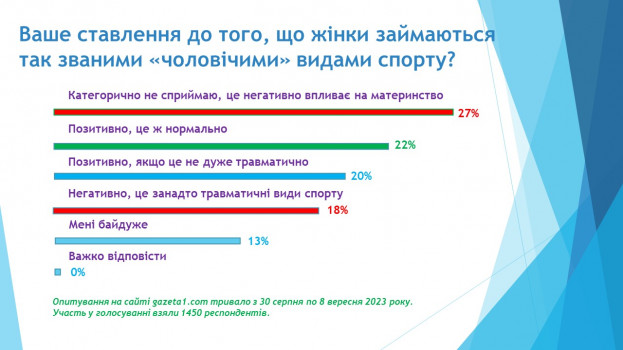 До речі, нещодавно на нашому сайті (https://www.gazeta1.com) завершилося опитування, у якому ми запропонували своїм читачам і читачкам висловити своє ставлення до того, що жінки займаються так званими «чоловічими» видами спорту (футболом, боксом тощо)? Ось його підсумки: