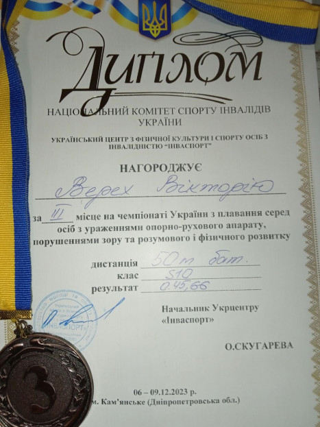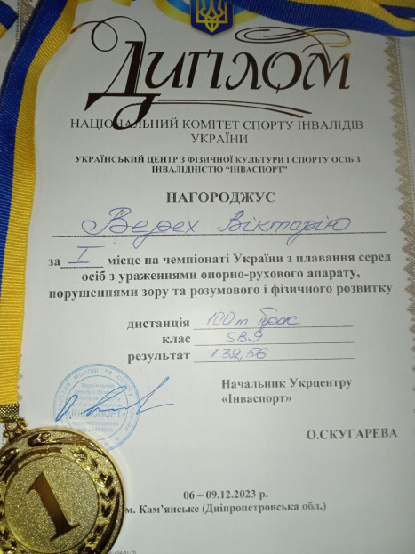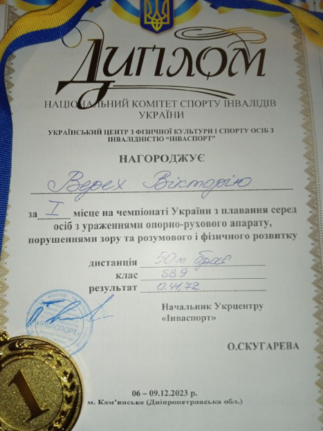 З 6 по 9 грудня у Кам’янському, що Дніпропетровщині проходив дорослий чемпіонат України з плавання серед осіб з ураженнями опорно-рухового апарату. Просто неймовірний результат на перших для себе змаганнях подібного рівня продемонструвала 14-річна тернополянка Вікторія Верех (тренер – Юрій Богданович Редьква), яка стала дворазовою чемпіонкою.