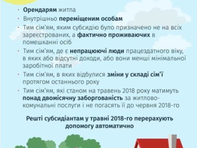 Уже зараз до управління соціального захисту населення необхідно звернутися тим сім’ям, яким до цього субсидії були призначені не на всіх проживаючих у домогосподарстві. Тобто кількість тих, хто мешкає у квартирі чи оселі не відповідає кількості зареєстрованих. Також щодо перепризначення субсидій необхідно звернутися тим домогосподарствам, у яких відбулися зміни  в сімейному стані; внутрішньо переміщеним особам; особам, члени сім’ї яких не зареєстровані за адресою домогосподарства; особам, які є орендарями житлових приміщень (будинків). Мають це також зробити і ті, у кого відсутній дохід або він нижчий за середню заробітну плату. Також необхідно звернутися тим, хто має заборгованість за спожиті комунальні послуги, що перевищує 340 гривень.