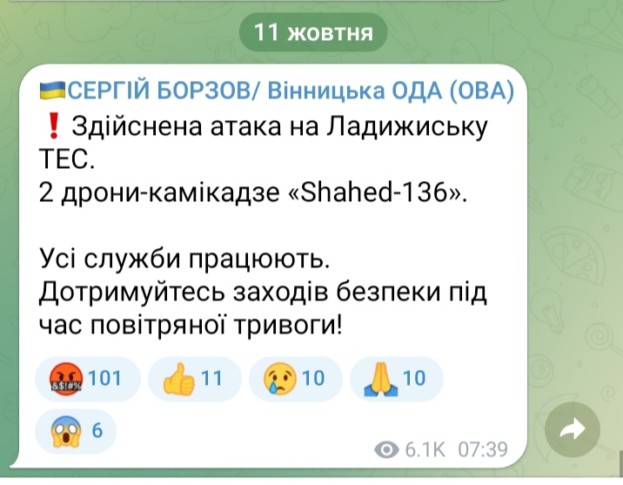Здійснена атака на Ладижинську ТЕС. Застосовано два дрони-камікадзе «Shahed-136». Про це повідомив голова Вінницької обласної військової адміністрації Сергій Борзов.