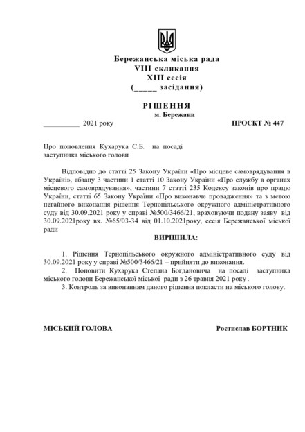 7 травня 2021 року чиновник був звільнений більшістю депутатського корпусу міськради Бережан за неналежне виконання посадових обов`язків. Після цього Кухарук подав позов до суду і 30 вересня цього року Тернопільський окружний адміністративний суд прийняв рішення про поновлення його на посаді заступника. При цьому суд вимагав поновити його на посаді заднім числом, а саме з 26 травня 2021 року. Більше того, Бережанська міська рада мала йому виплатити середній заробіток за час вимушеного прогулу з 26 травня по 30 вересня 2021 року в сумі 116 тисяч 747 гривень 55 копійок або 27 тисяч 617 гривень 71 копійку щомісяця.