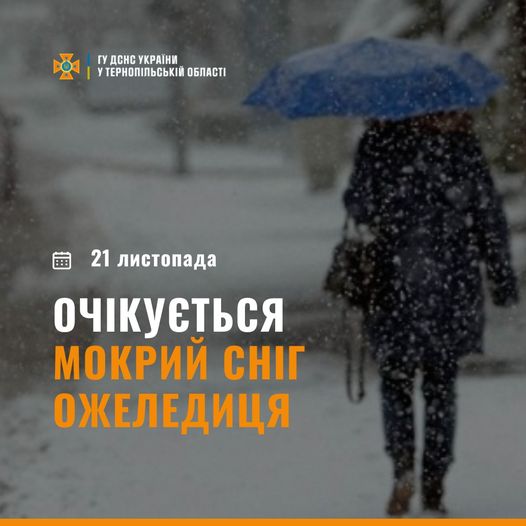 За інформацією Тернопільського обласного центру з гідрометеорології, 21 листопада на Тернопільщині буде хмарно, місцями дощ, подекуди з мокрим снігом. Вітер південно-західний, 5 – 10 м/с. Вночі та вранці на дорогах очікується ожеледиця. Температура впродовж доби коливатиметься від +1 до +6 за Цельсієм.