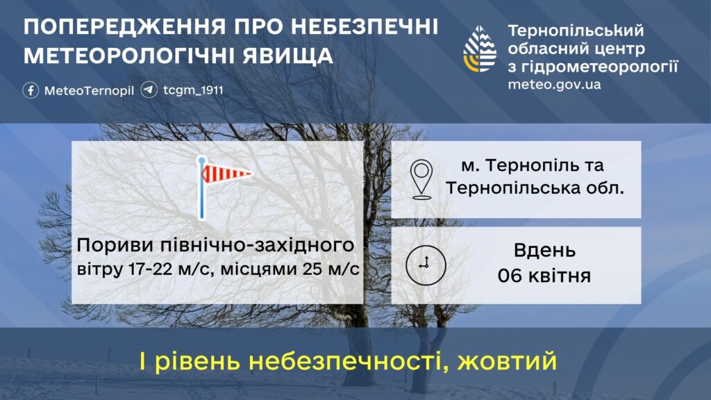 - Область: 6 квітня вдень пориви північно – західного вітру 17 – 22 м/с, місцями 25 м/с.