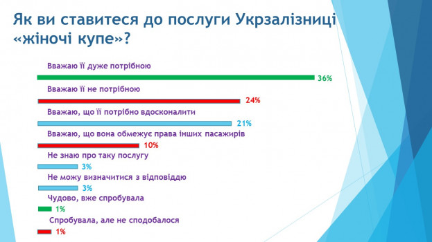 Участь у голосуванні взяли 1167 респондентів. Як бачимо з результатів, більше третини опитаних таки вважають нововведення Укрзалізниці дуже потрібним. Водночас чверть респондентів не вбачають потреби у жіночих купе. П’ята частина опитаних зауважила, що послугу ще потрібно вдосконалювати. Не знали про таку послугу всього 3% респондентів.