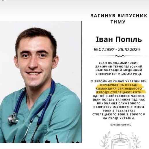 – Це був мужній, сміливий, відданий військовій присязі воїн, надійний товариш і бойовий побратим, який віддав своє життя за вільну і незалежну Україну. Колектив ТНМУ сумує і висловлює щирі співчуття рідним та близьким з приводу загибелі Героя – Івана Попіля. Схиляємо голови у пошані до виконаного обов’язку і бережемо в серцях світлу пам’ять про нашого випускника. Царство Небесне! Вічна пам’ять Герою!, – йдеться в повідомленні ТНМУ.