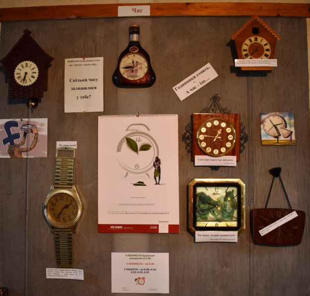 Тема «Час» показана різними годинниками і висловами відомих людей про те, що нам завше бракує часу. Ми не встигаємо… Родзинка в тому, що всі годинники стоять, а час – іде! І запитання: «Скільки часу залишилося в тебе?»