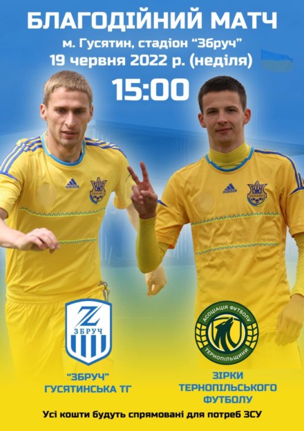 У неділю, 19 червня, Координаційний центр підтримки Збройних Сил України Асоціації футболу Тернопільщини організовує черговий з серії благодійних матчів команди зірок тернопільського футболу. Цього разу наші зірки проведуть поєдинок у Гусятині, де в суперниках буде місцева команда «Збруч», яка минулого року була бронзовим призером чемпіонату Тернопільської області (друга ліга).