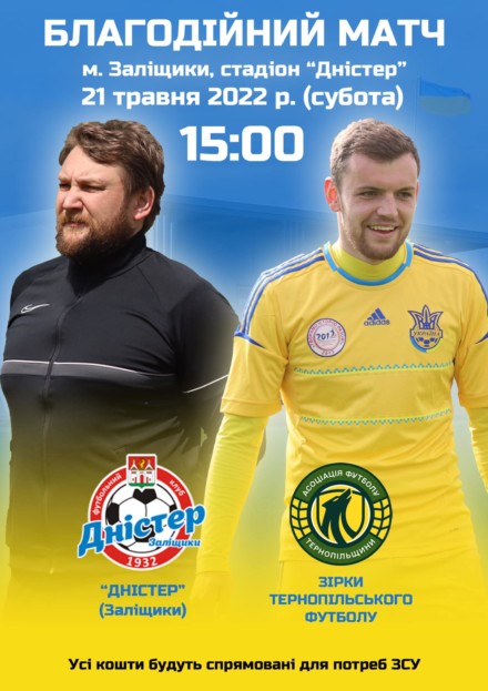 Координаційний центр підтримки Збройних Сил України Асоціації футболу Тернопільщини у суботу, 21 травня, організовує благодійний матч між командами зірок тернопільського футболу та заліщицьким «Дністром».
